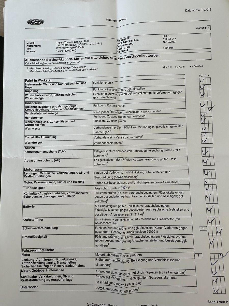 3. Bremsleuchte, Ablage im Dachhimmel Fahrerhaus, Airbag Fahrerseite, Antischlupfregelung (ASR), Audiosystem MyConnection (Radio/CD-Player MP3-fähig), Außenspiegel elektr. verstell- und heizbar, Batterie 60 Ah, Bord-/Verbrauchscomputer, Elektr. Bremskraftverteilung, Fahrassistenz-System: Berganfahr-Assistent (Hill-Holder), Fahrassistenz-System: Notbrems-Assistent, Getränkehalter vorn, Gurtstraffer, Heckflügeltüren ohne Verglasung, Innenraumfilter: Staub- und Pollenfilter, Karosserie/Aufbau: Kasten, Laderaumboden Kunststoff (Formteil), Laderaumtrennwand mit Durchladeöffnung, Laderaumwanne, Lenksäule (Lenkrad) höhen-/längsverstellbar, Leseleuchte vorn, LKW-Zulassung, Motor 1,5 Ltr. - 74 kW TDCi KAT, Radstand 2662 mm, Schadstoffarm nach Abgasnorm Euro 6, Schaltpunktanzeige, Schiebetür rechts, Sitz-Paket 18, Start/Stop-Anlage, Starter-Paket, Stau-/Ablagefach unter Sitz vorn rechts, Stoßfänger Wagenfarbe, Umluftschaltung elektr. betätigt, Verglasung getönt