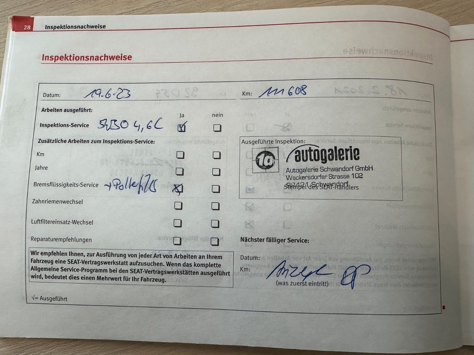 letzte Inspektion bei 111608 km 06.2023