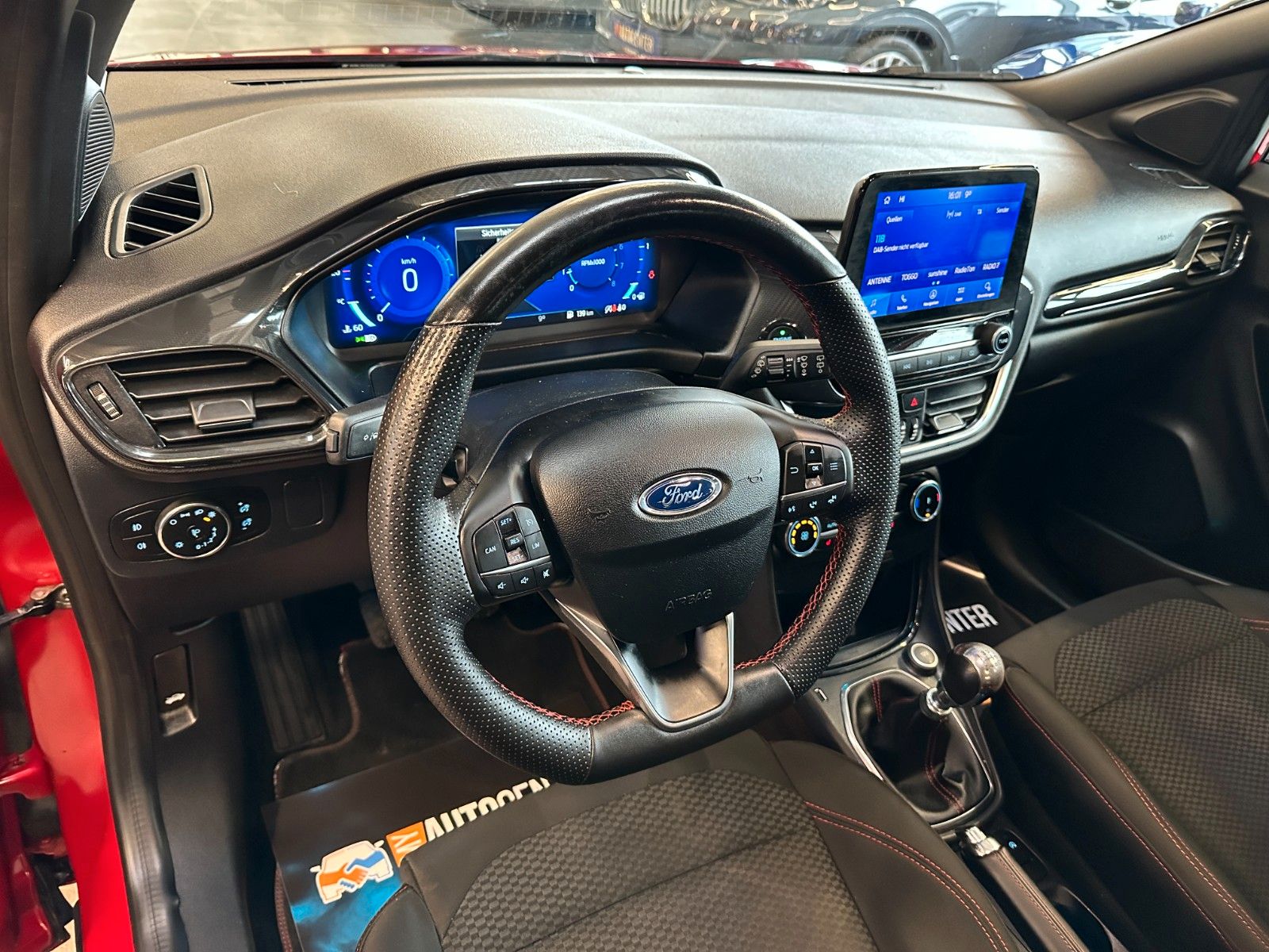 Ambiente-Beleuchtung vorn (LED), Antischlupfregelung (ASR), Audio-Navigationssystem Ford mit AppLink, Außenspiegel elektr. anklappbar, Außenspiegel elektr. verstell- und heizbar, Body-Styling-Paket, Dachhimmel Stoff, dunkel, Eco-Anzeige für verbrauchsoptimiertes Fahren (EcoCoach), Einparkhilfe hinten, Fahrassistenz-System: Berganfahr-Assistent (Hill-Holder), Fahrassistenz-System: Falschfahrer-Warnfunktion, Fahrassistenz-System: Fernlichtassistent (Scheinwerfer mit Abblendautomatik), Fahrassistenz-System: Notbrems-Assistent, Fahrassistenz-System: Post-Collision-System, Fahrassistenz-System: Pre-Collision-System, Fahrassistenz-System: Spurhalteassistent mit Müdigkeitserkennungs-Sensor, Fahrassistenz-System: Verkehrsschildassistent, Farbdisplay für Bordcomputer, Fensterheber elektrisch vorn + hinten mit Komfortschließung, FordPass Connect inkl. eCall, Fußmatten Teppich, Getriebe 6-Gang - Typ: 6MX65, Heckleuchten LED, Innenraumfilter: Staub- und Pollenfilter, Intelligent Protection System (IPS), Intelligenter Geschwindigkeits-Begrenzer, Isofix-Aufnahmen für Kindersitz, Karosserie: 5-türig, Kombiinstrument Digitalanzeige 12,3 Zoll, Kopfstützen hinten mechan. verstellbar (3 Stück), Lackierung Blazer-Blau uni, Laderaumboden variabel (Ford Megabox), Lendenwirbelstütze Sitz vorn links, Lenksäule (Lenkrad) höhen-/längsverstellbar, LM-Felgen, Mild-Hybrid 92 kW (Motor 1,0 Ltr. - 92 kW EcoBoost), My Key (2. Fahrzeugschlüssel programmierbar), Nebelscheinwerfer LED, Otto-Partikelfilter (OPF), Pedale Aluminium, Radstand 2588 mm, Reifen-Reparaturkit, Reifendruck-Kontrollsystem, Rücksitzlehne geteilt/klappbar (60:40), Schadstoffarm nach Abgasnorm Euro 6d, Scheinwerfer LED, Scheinwerfer-Assistent mit Tag-/Nachtsensor, Sitze vorn höhenverstellbar, Sonnenblende links mit Spiegel (beleuchtet), Sonnenblende rechts mit Spiegel (beleuchtet), Sport-Fahrwerk, Sportsitze vorn, Standard Variante, Start/Stop-Anlage, Türgriffe außen Wagenfarbe